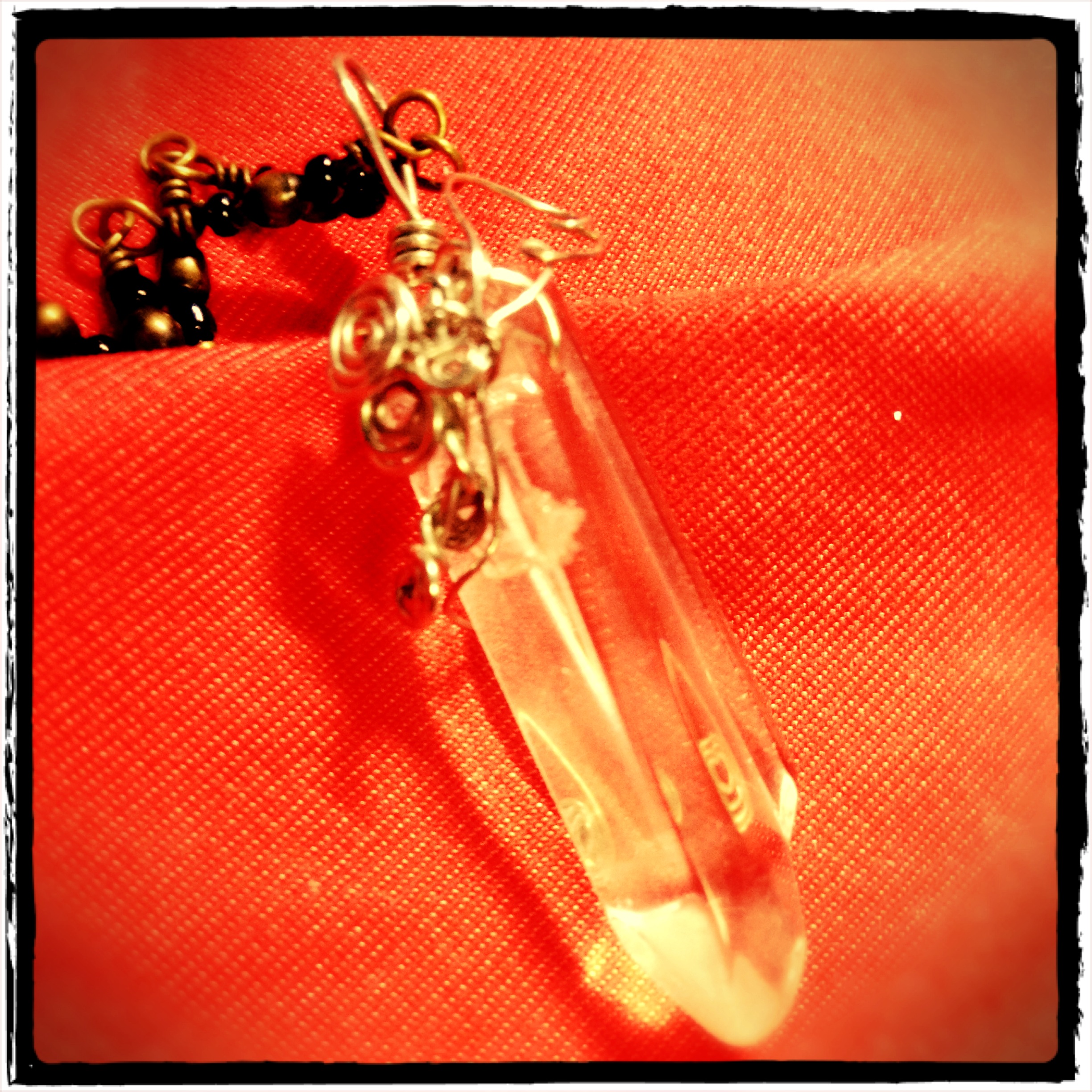 水晶を買ってきて、そのまんま鎖に通すのもなーと思っての挑戦だったけど、ワイヤーが細すぎて今ではちんまりとアクセ皿の上に鎮座しております…。